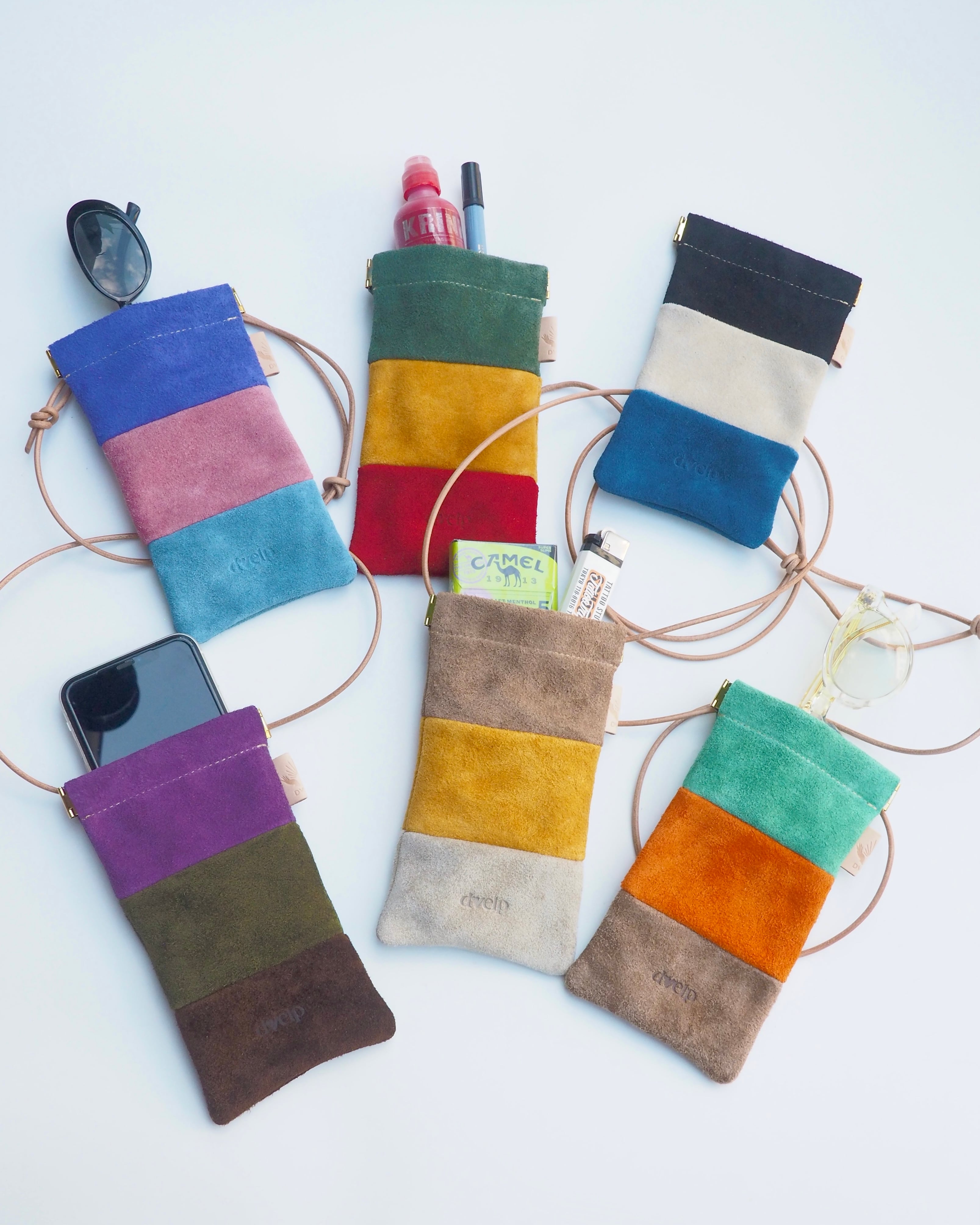 程よい毛羽立ちと発色の良い国産牛スエードを使用し、トリカラーで作られたマルチケース。