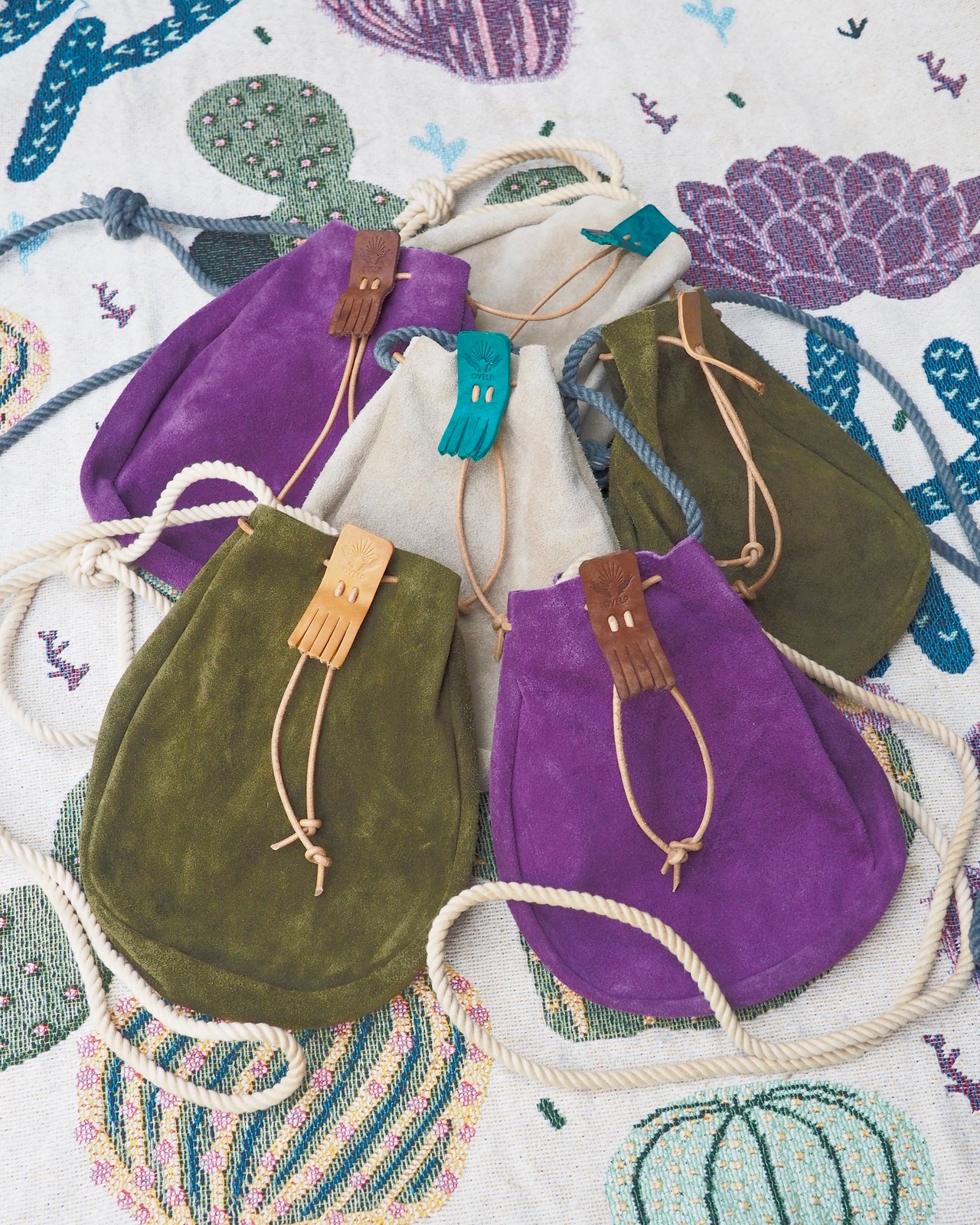 程よい毛羽立ちと、発色の良い国産牛スエードを使用した、巾着タイプのショルダーバッグ。