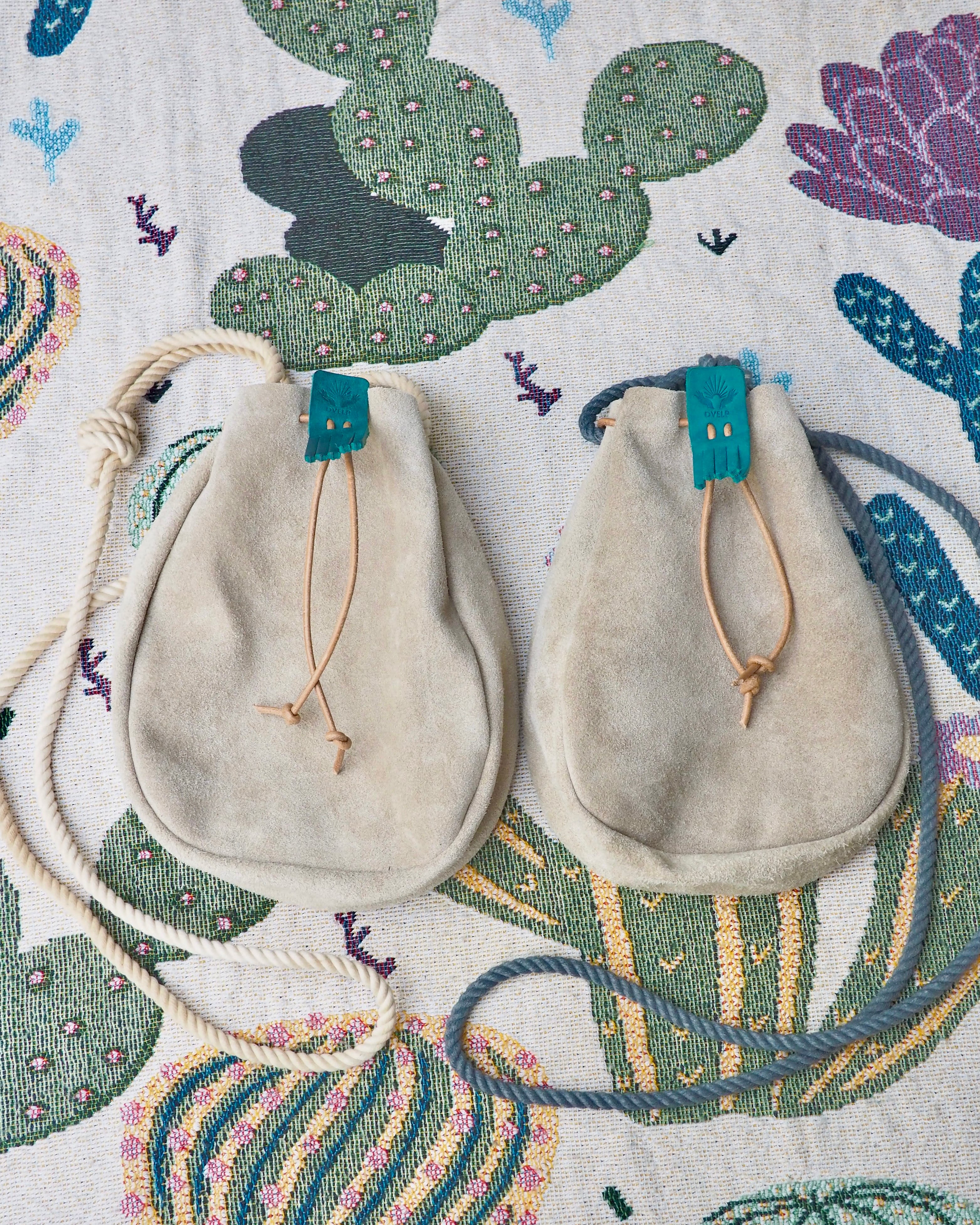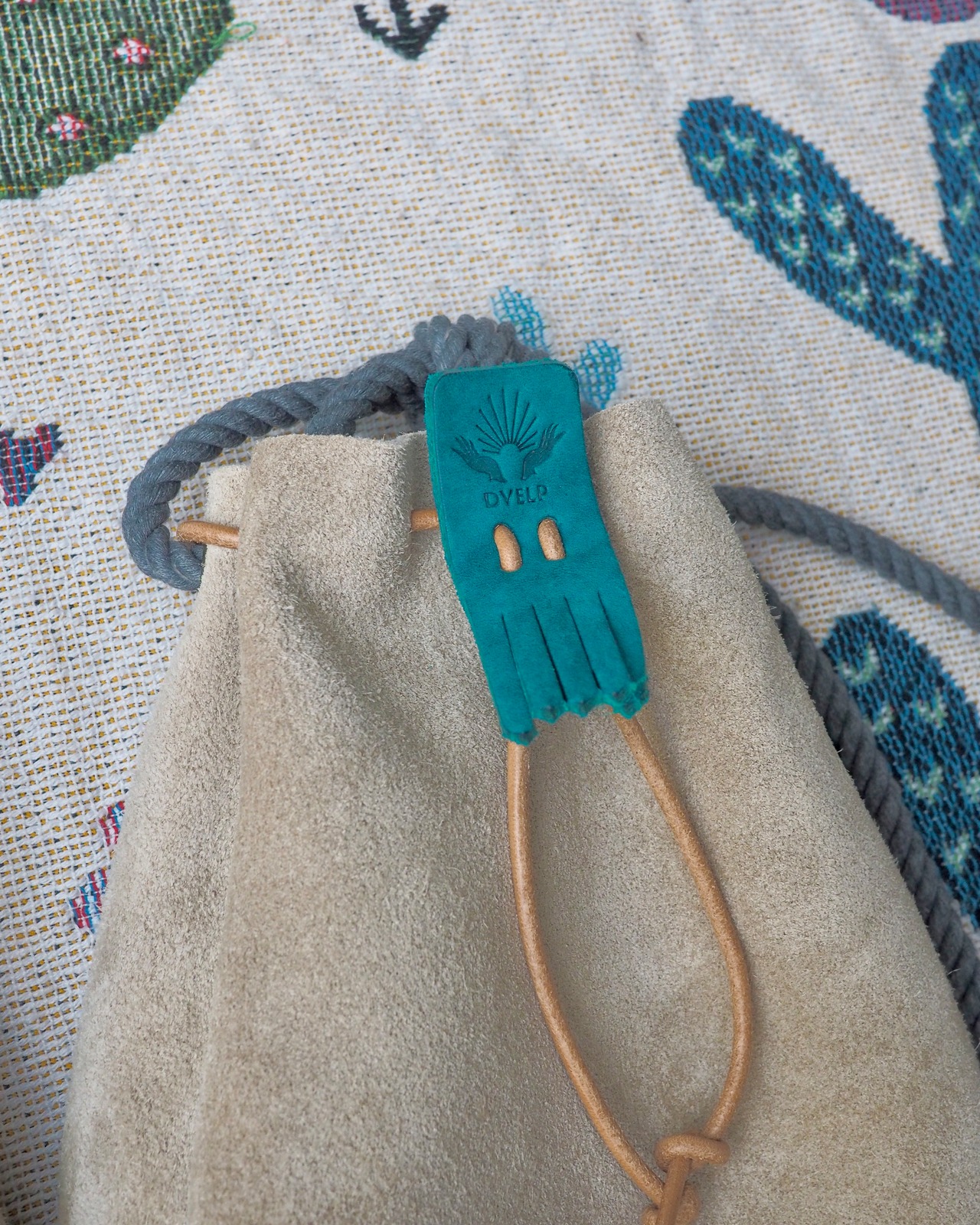 巾着ひもはヌメ革の丸紐、フリンジになったロゴ刻印入りのストッパーで、開閉が自由に。
