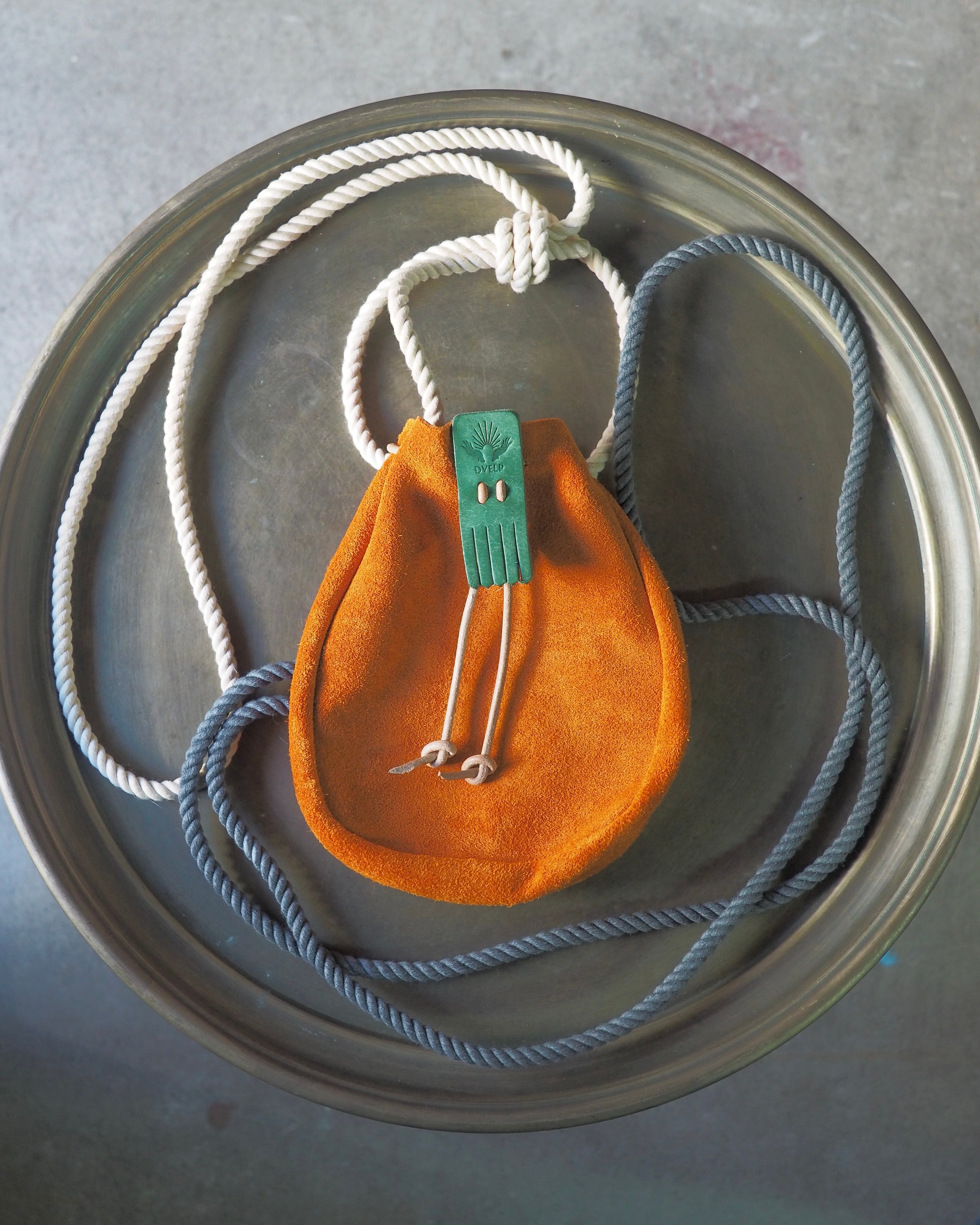 巾着ひもはヌメ革の丸紐、フリンジになったロゴ刻印入りのストッパーで、開閉が自由に。