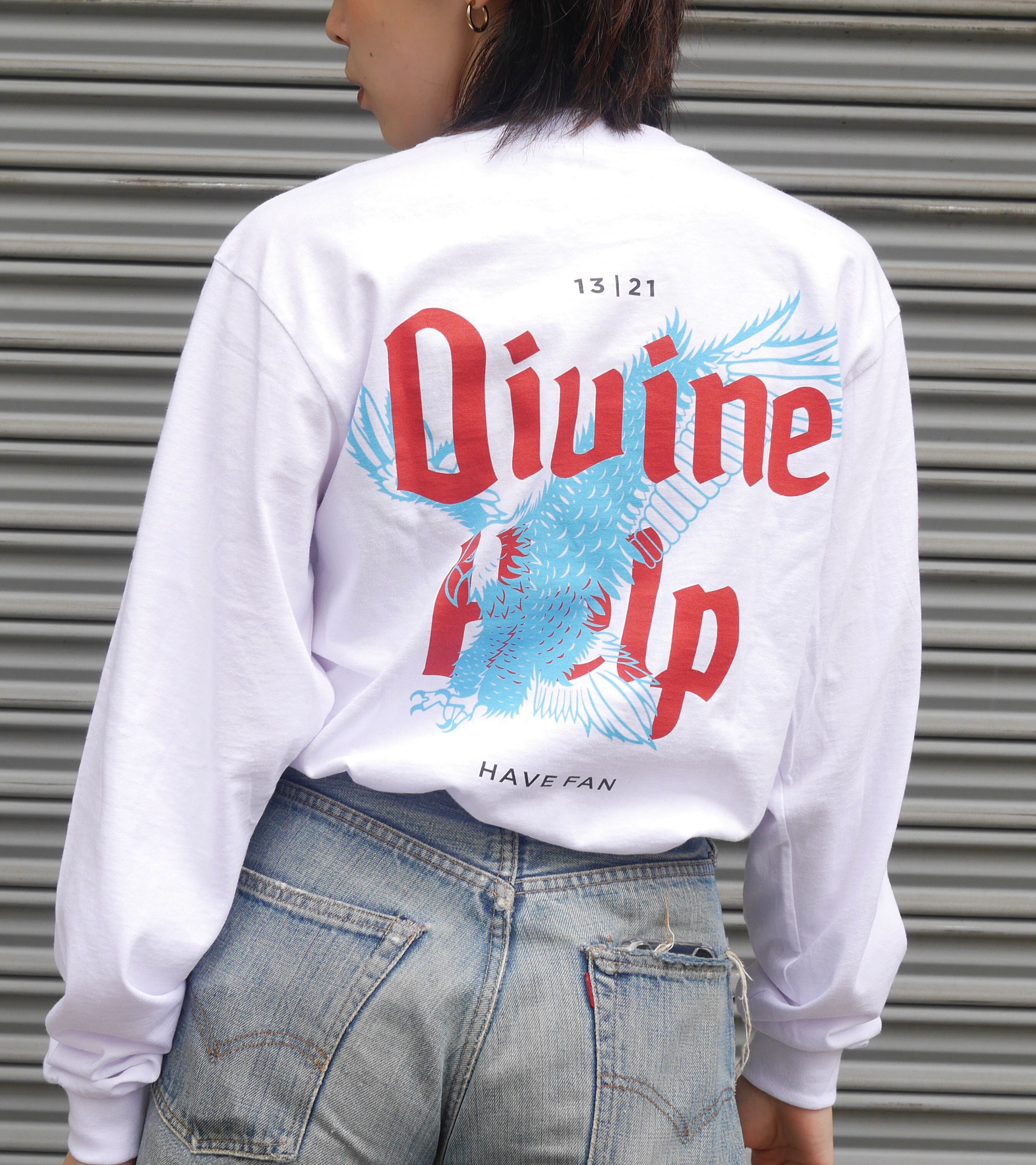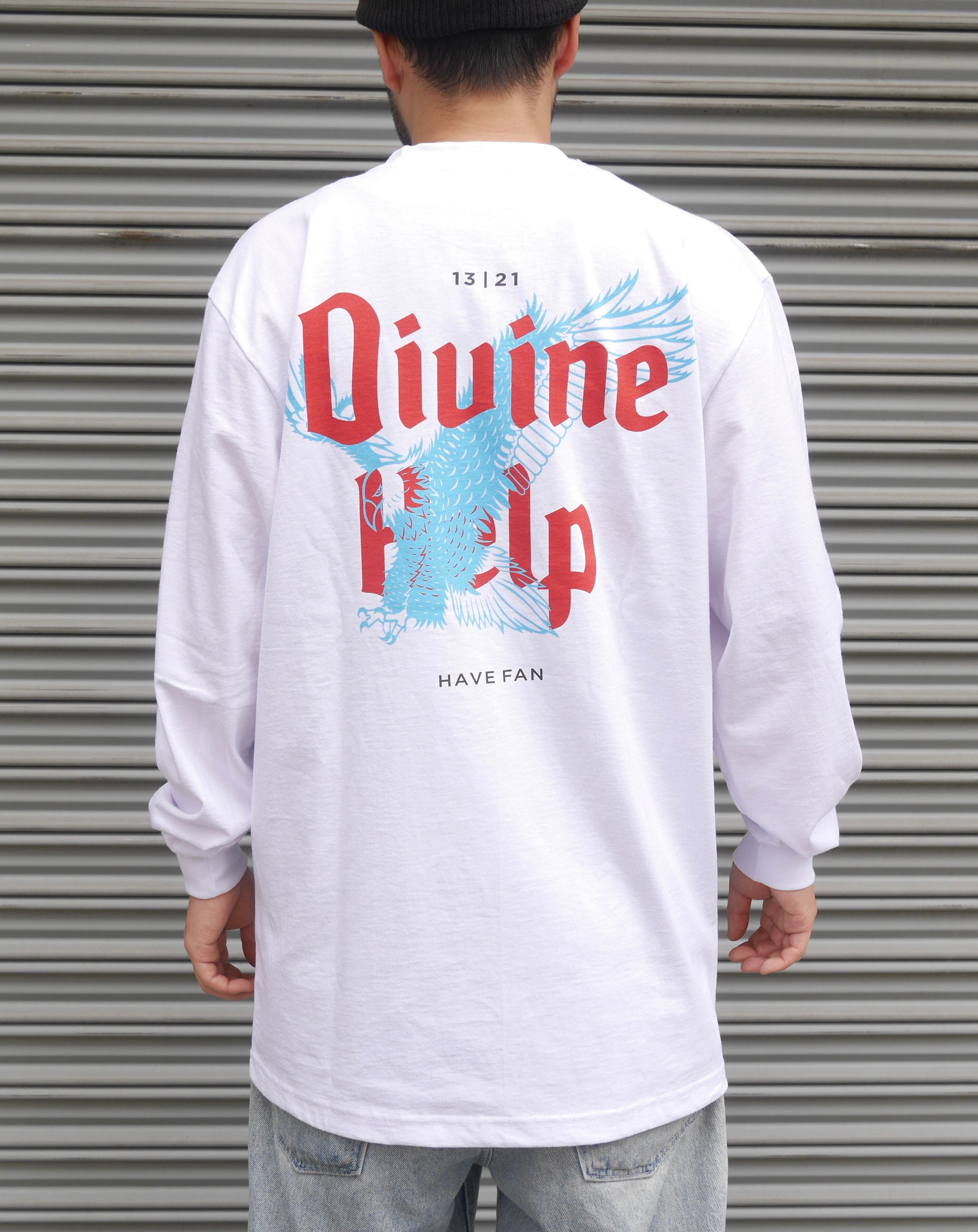 バックに大きく羽ばたく鷲と、ブランドの語源でもある "Divine Help" が見え隠れするデザイン。