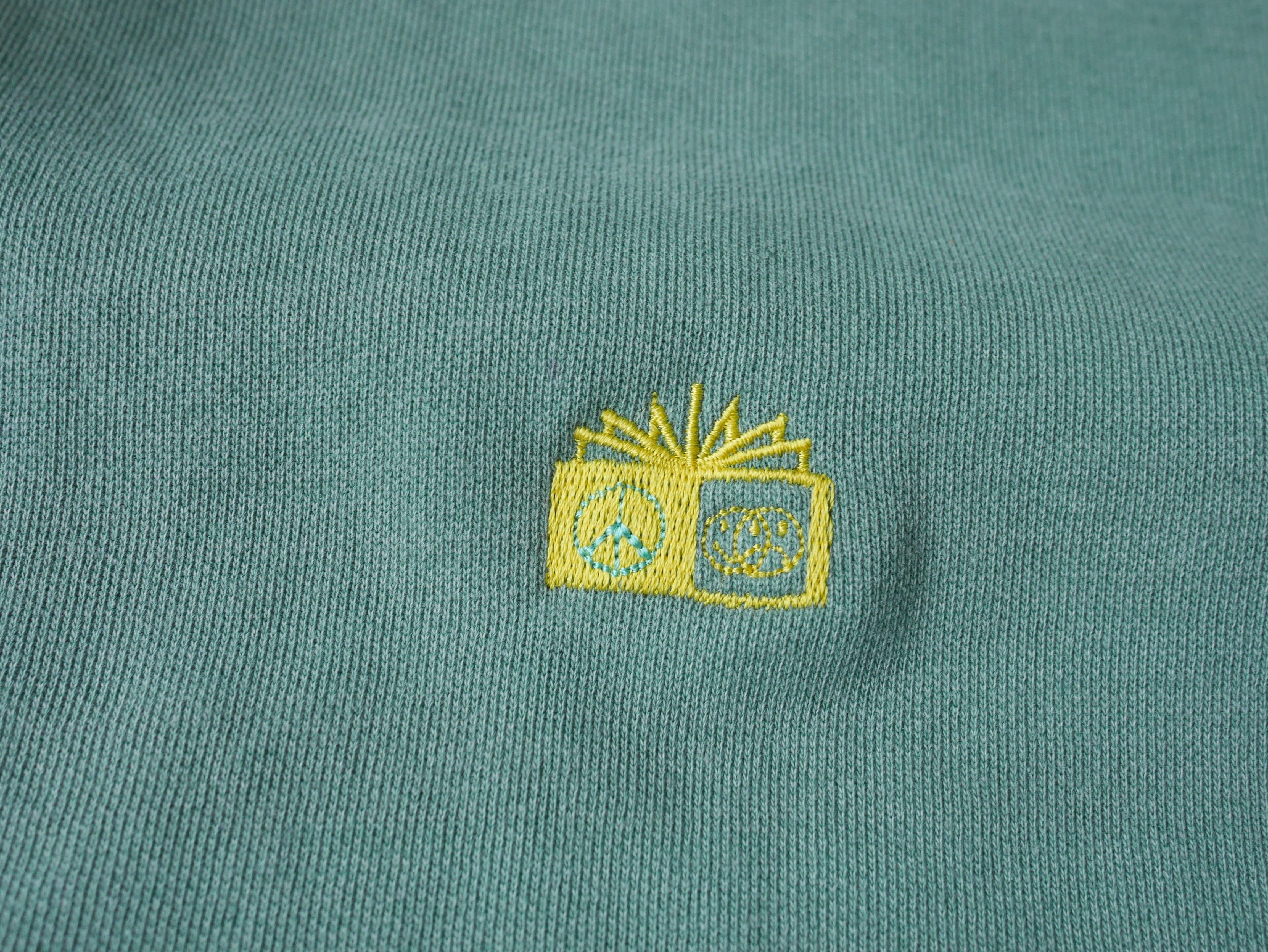 Peaceで可愛いデザイン達をラスタカラーで刺繍。