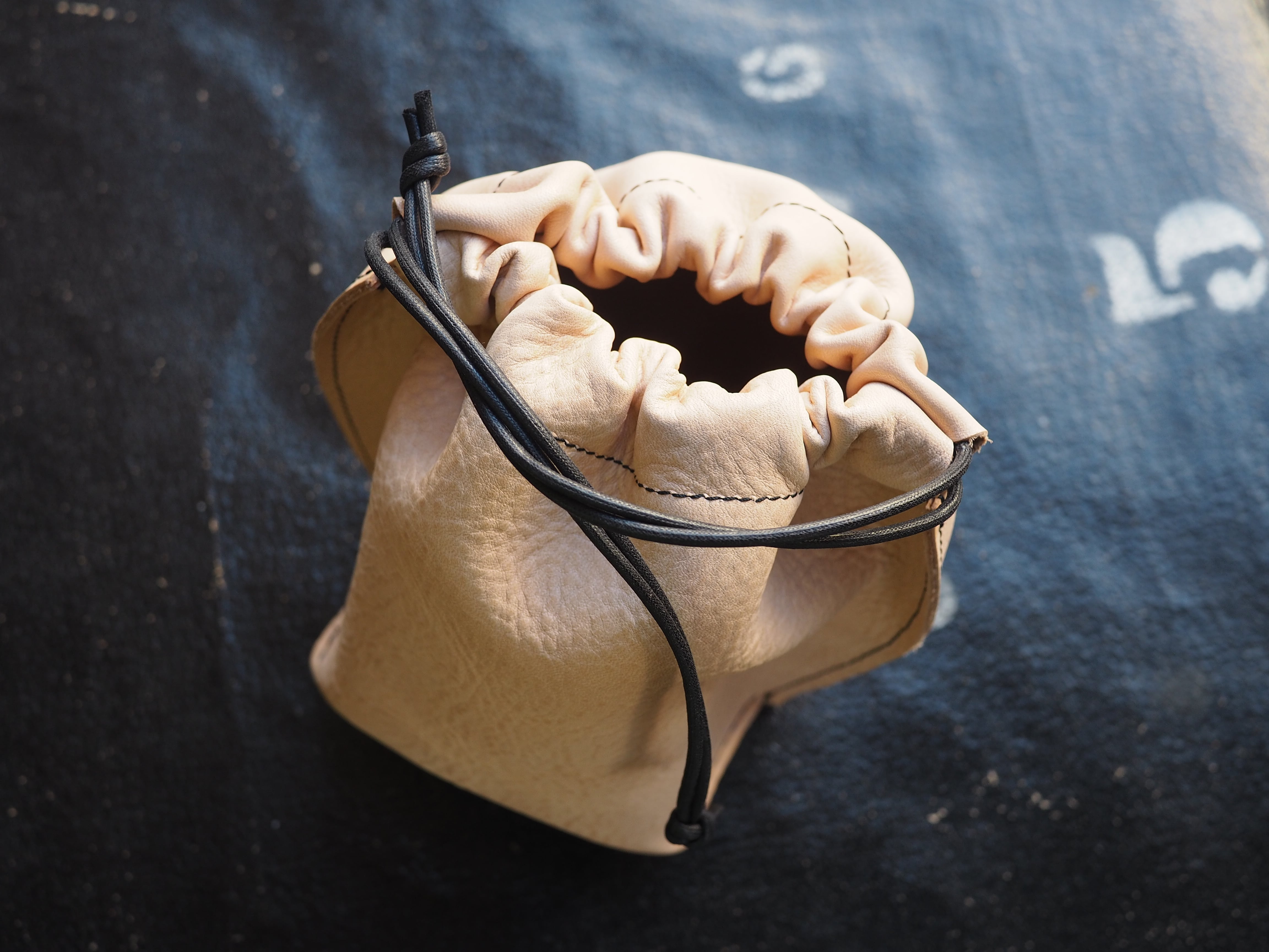 普段は革紐を使用しますが、巾着を開閉する際に滑りやすくする為、コットン100%のワックスコードを採用しています。