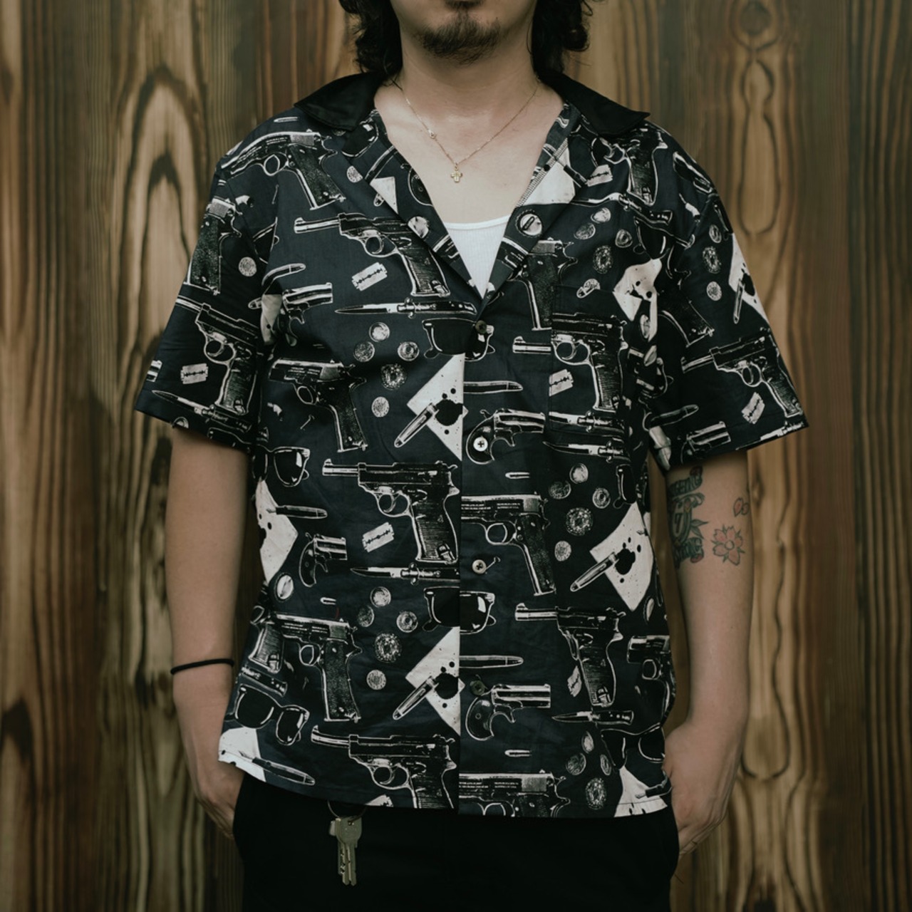 一見悪そうな総柄シャツ。