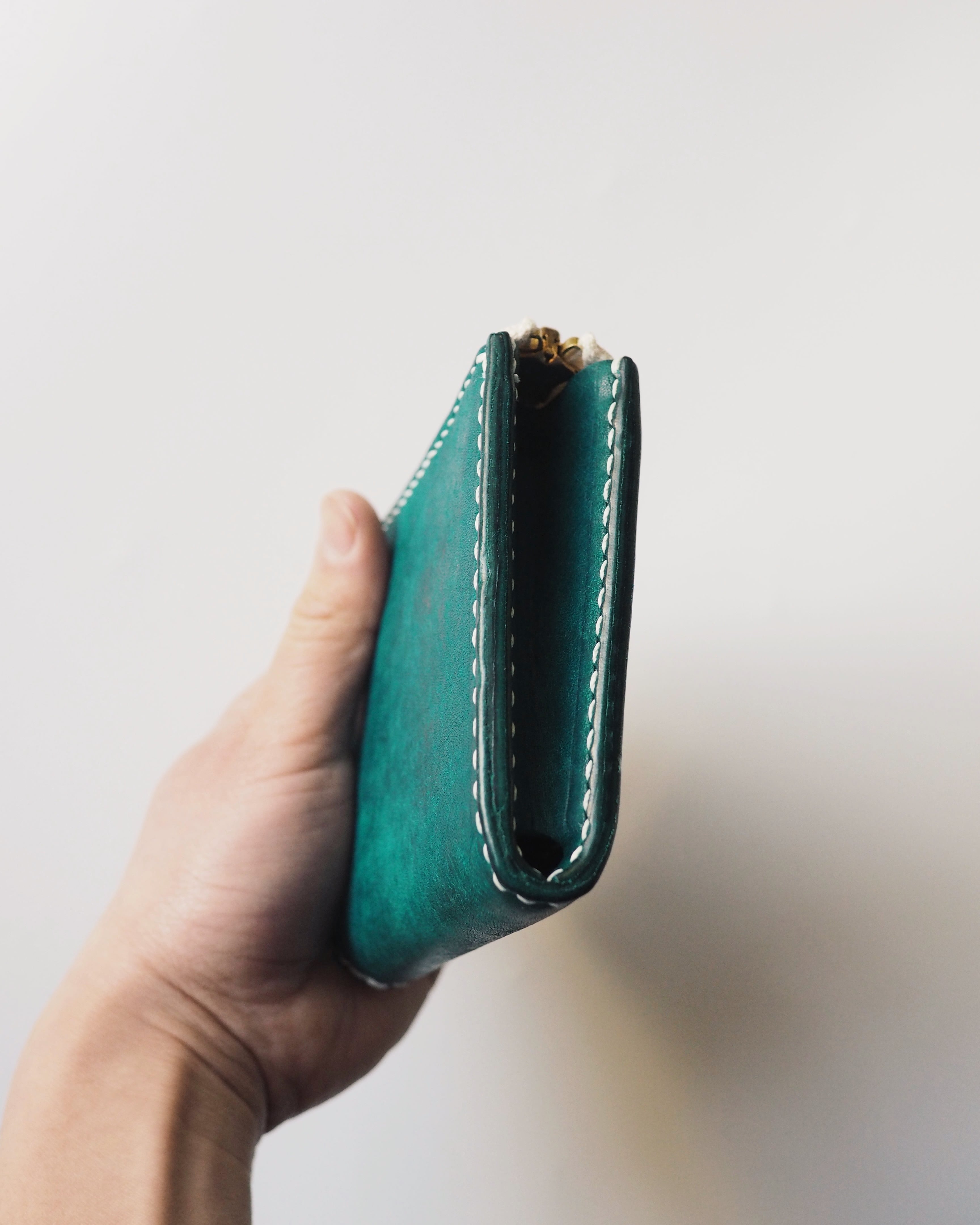 今後ミシン縫い製品も展開していきますが、こういったメインとなるお財布はなるべく手縫いで展開していきます。