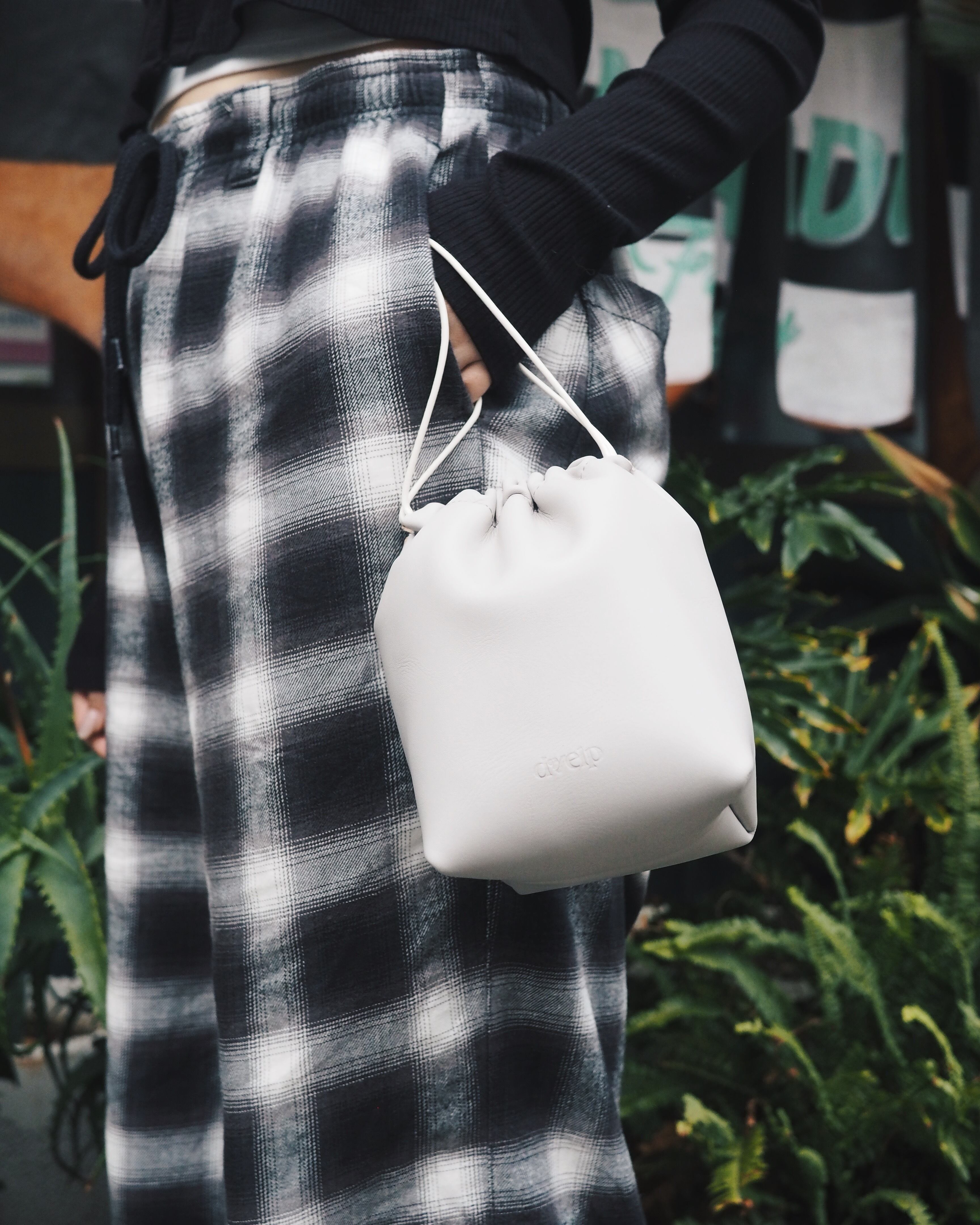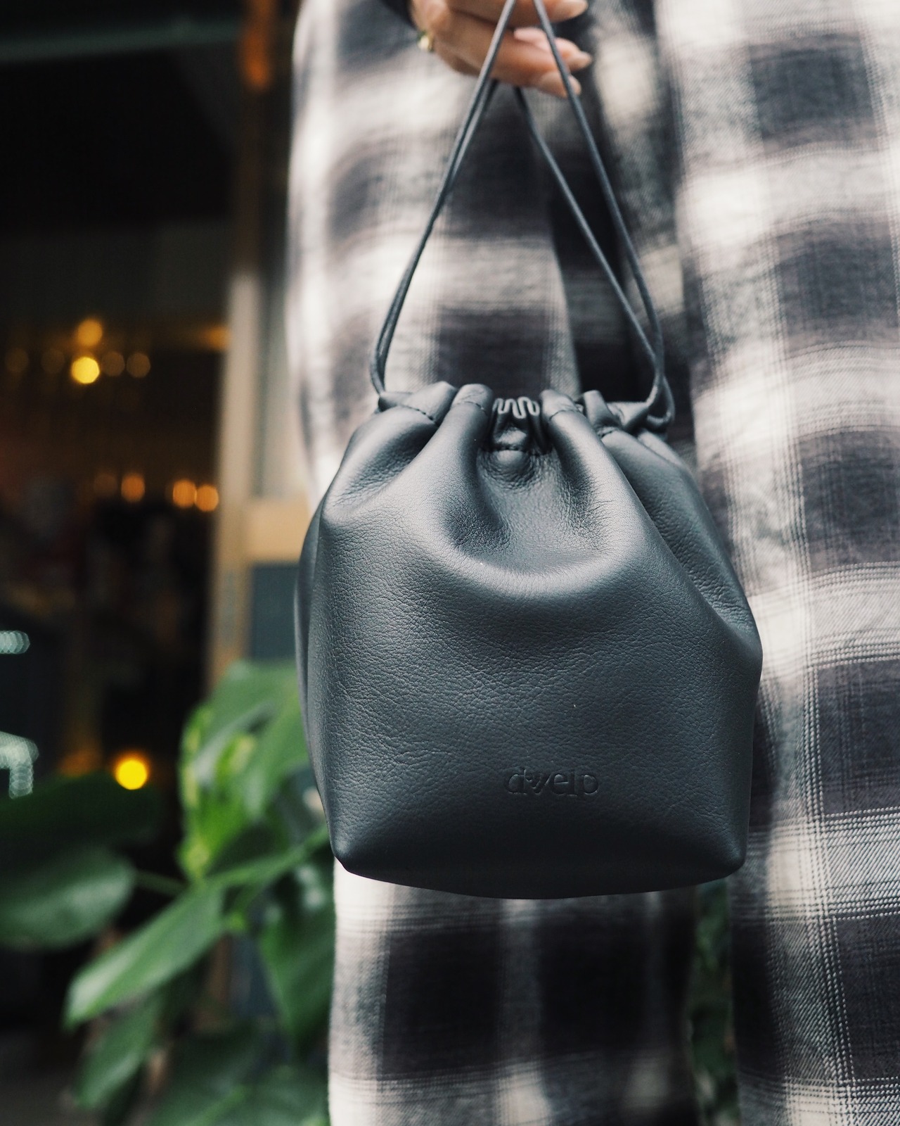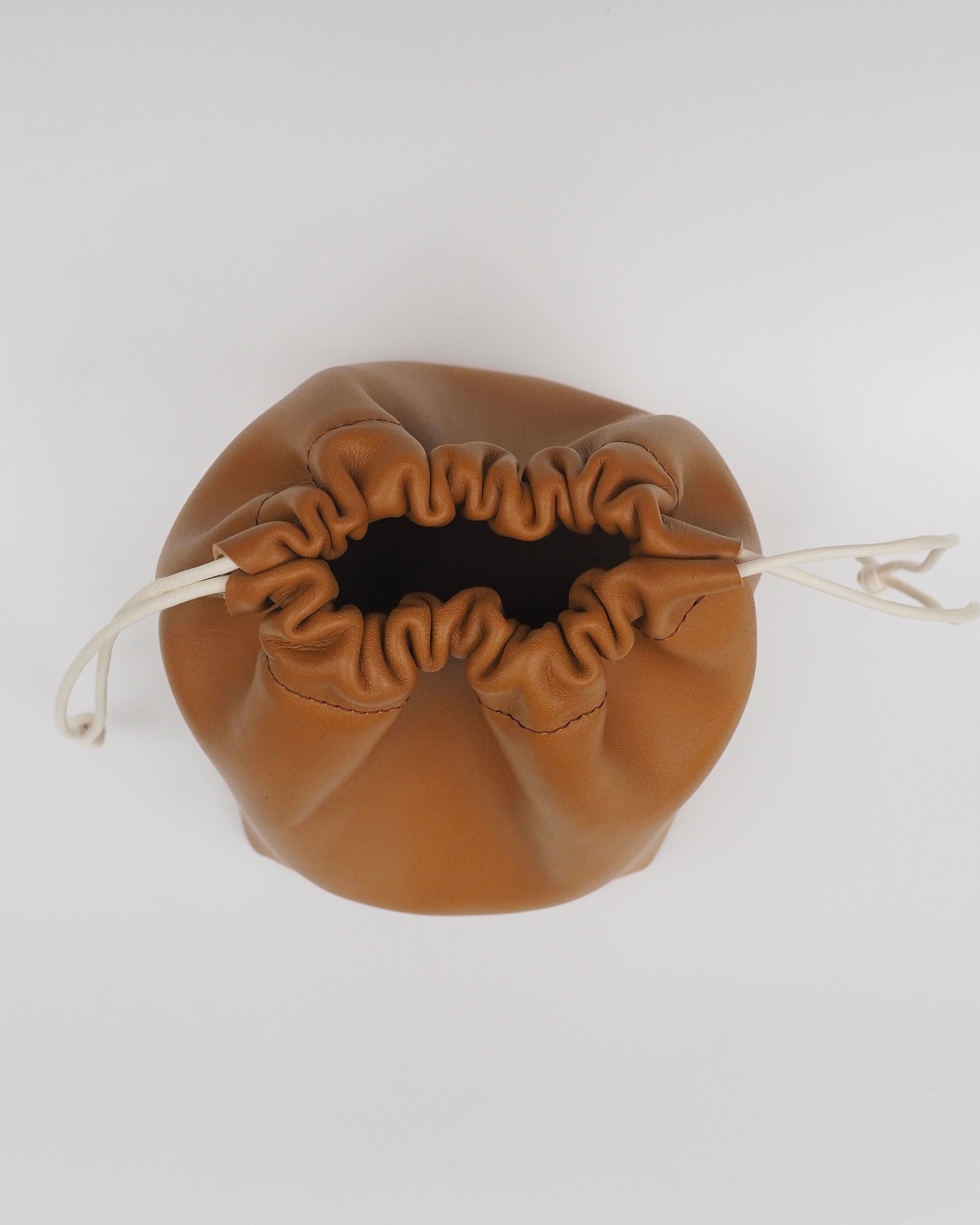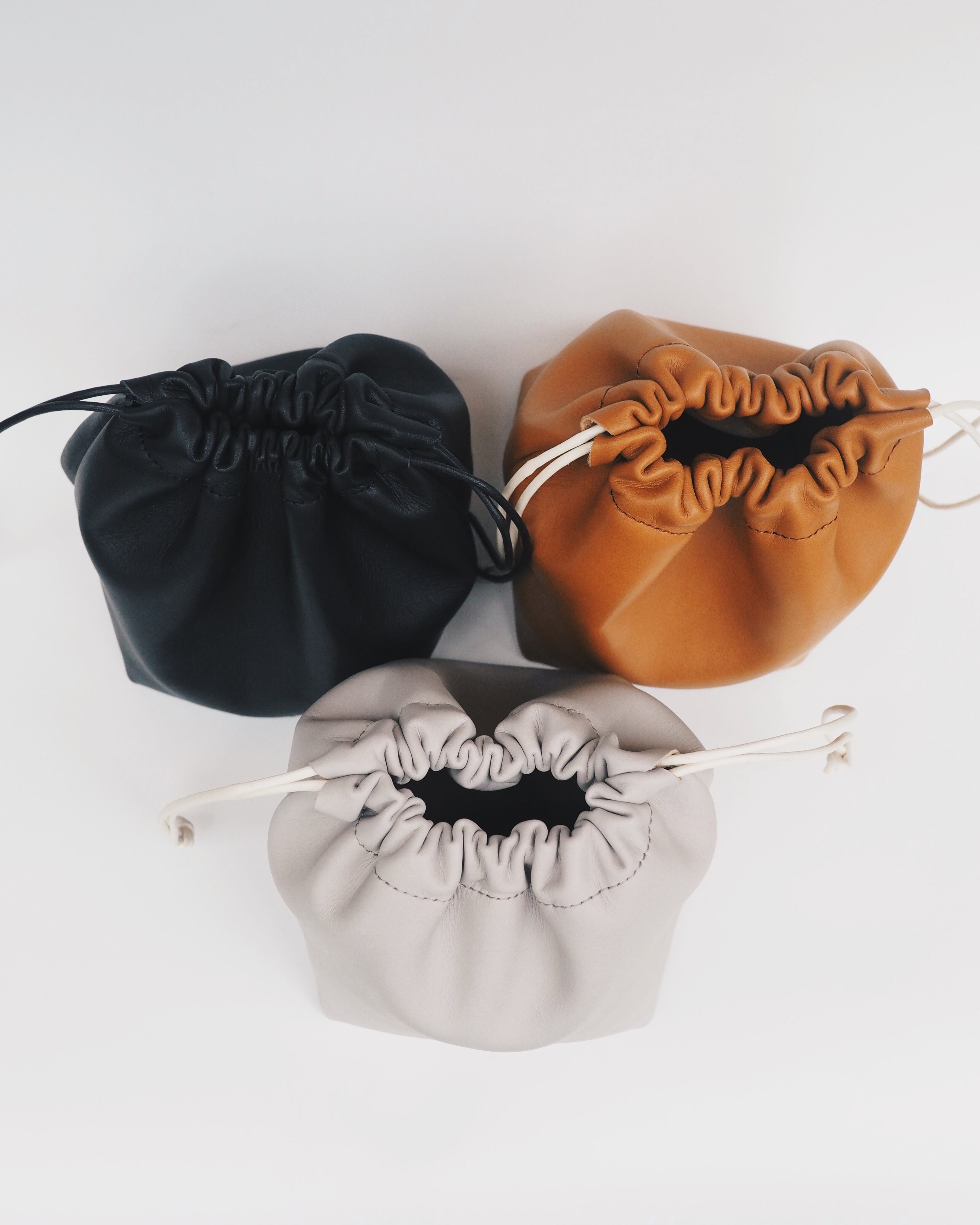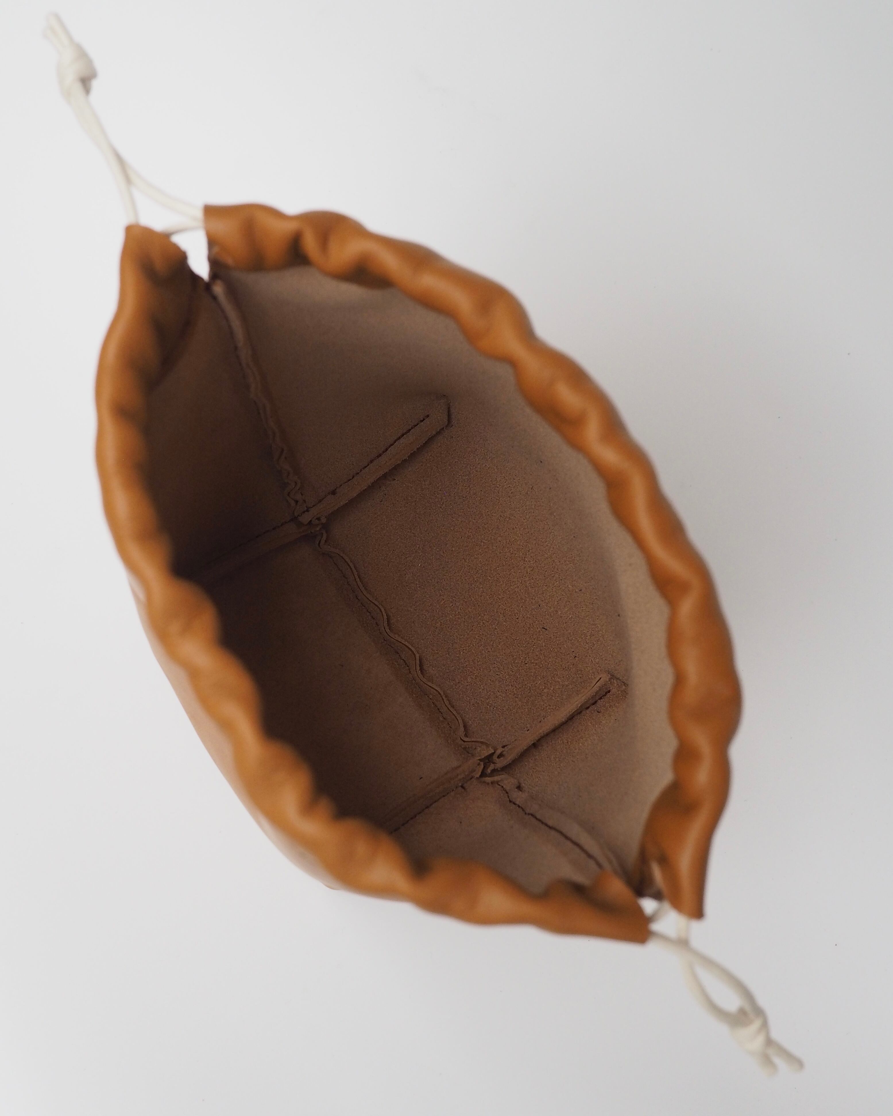 程良く柔らかい牛革を使用した巾着タイプのミニバッグ。