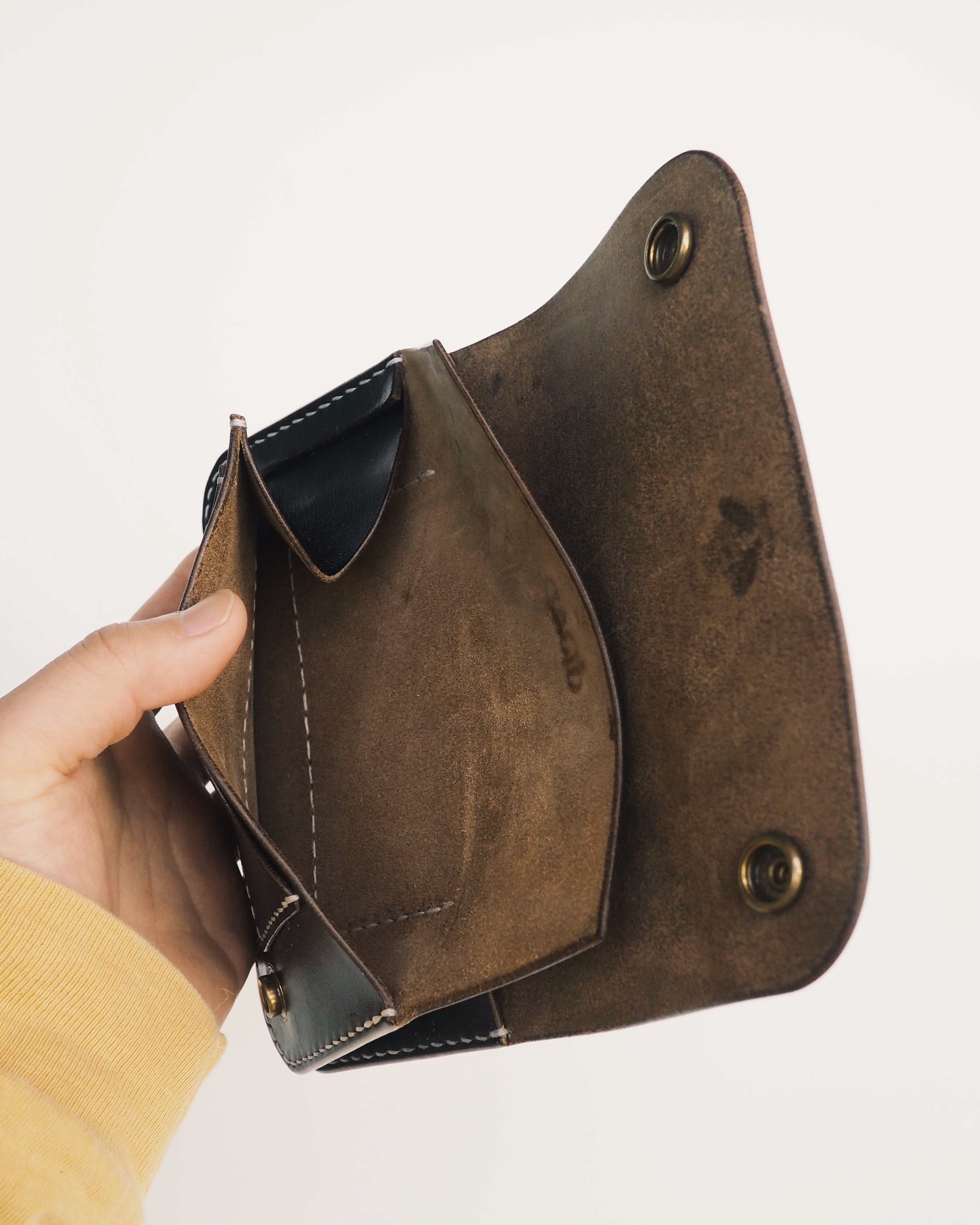 コインをすぐに取り出せる様、ファスナーなしのフラップコインケース。マチ付きで深さもあるので大容量になってます。