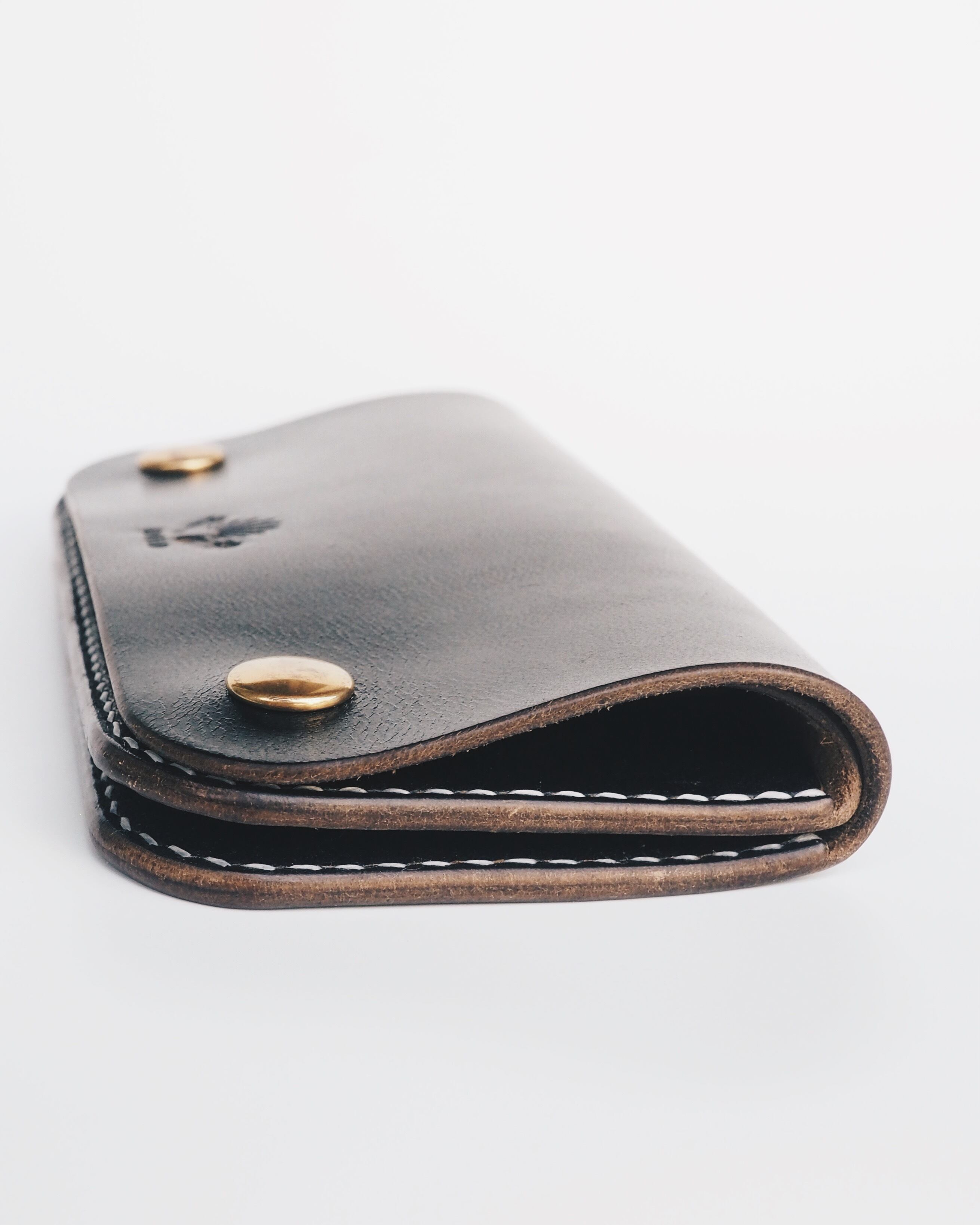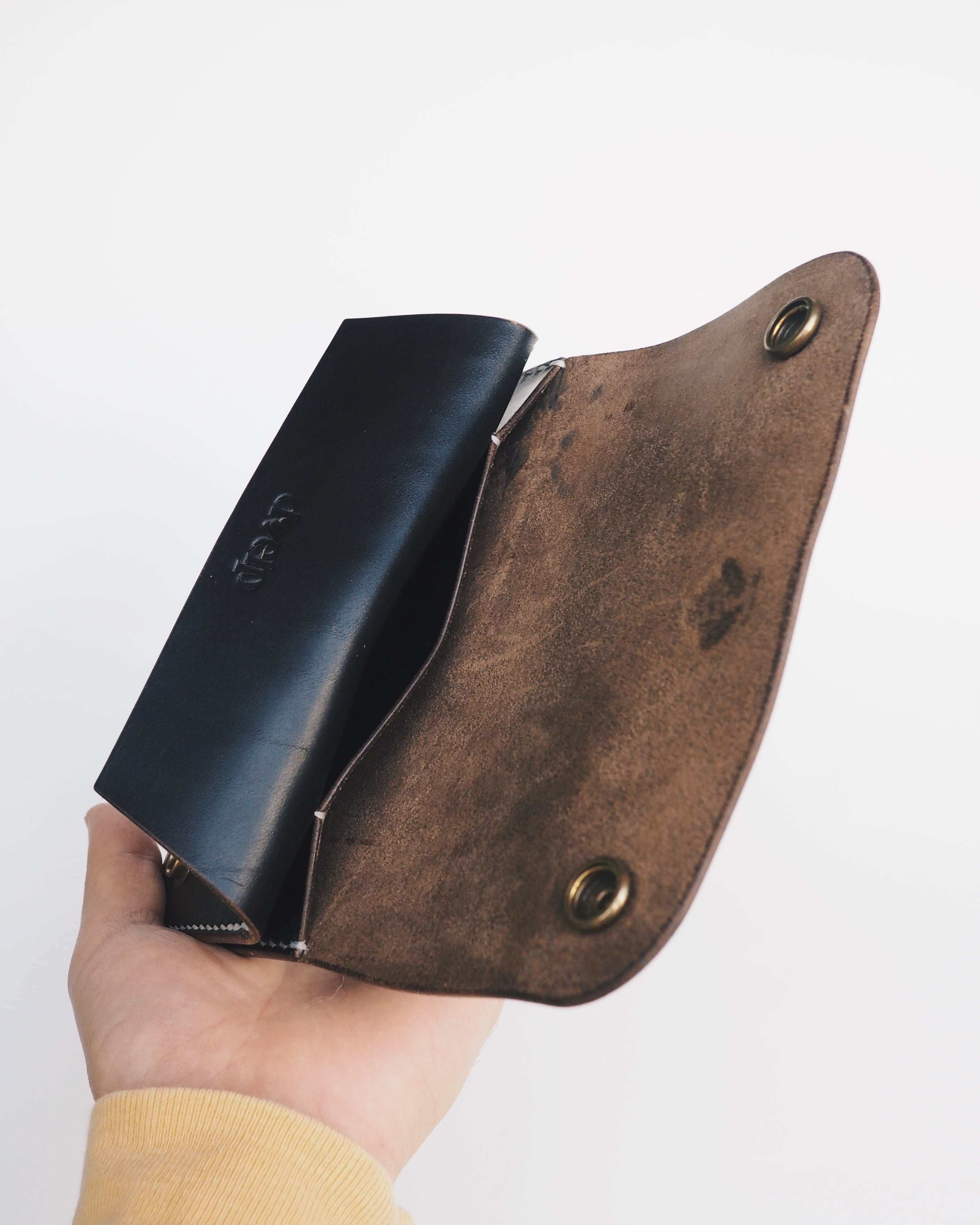 馬の「BUTT / バット」と呼ばれる線維密度の高い臀部(尻部分)を植物タンニンで鞣し、茶系の色で下地染色をした後、表面を黒の顔料で塗装した茶芯レザーになります。