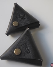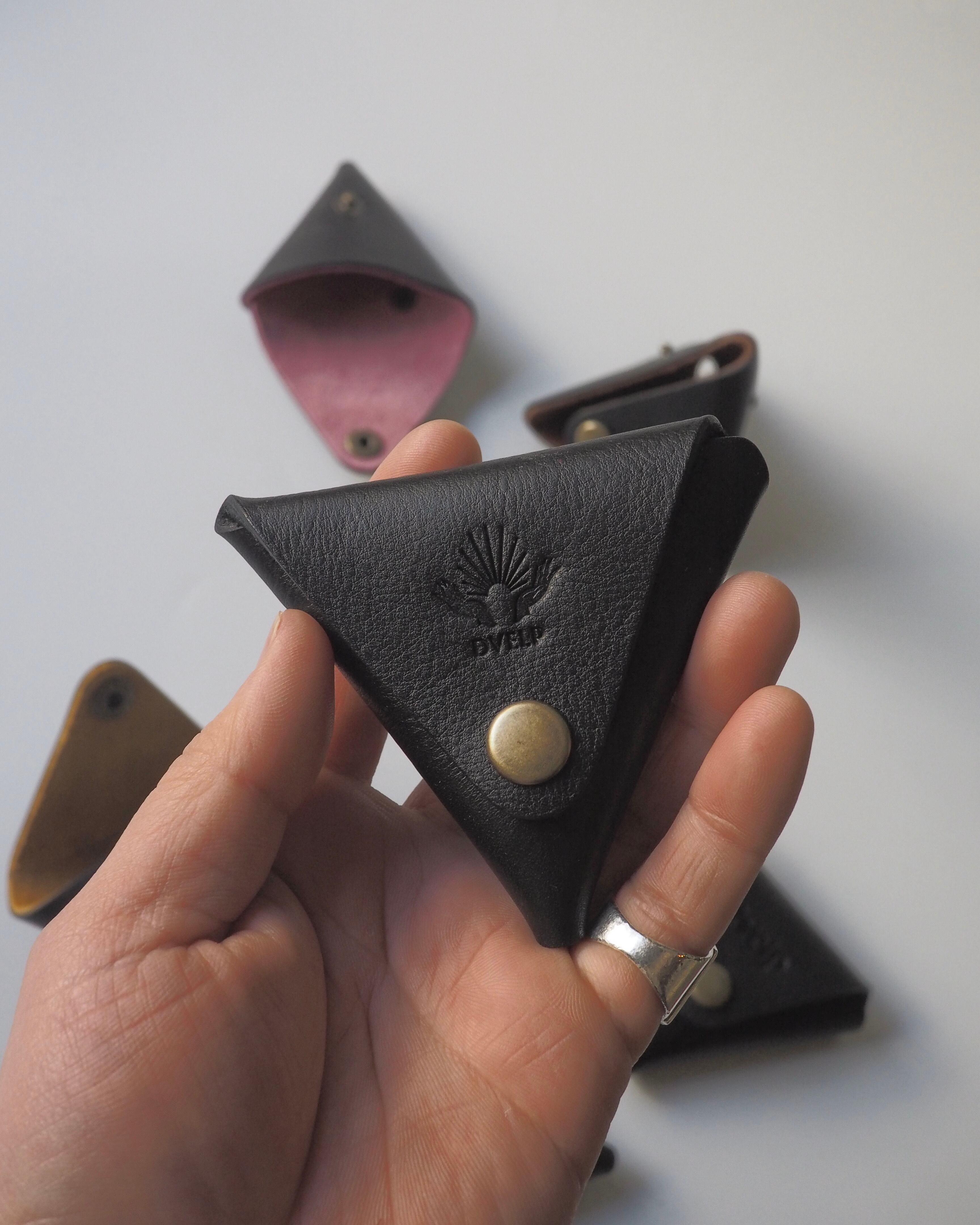 シュリンクレザーとスエードレザーを組み合わせたトライアングルコインケース。